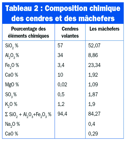 Le tableau 2, résume la composition chimique des cendres et des mâchefers particulièrement les valeurs moyennes des pourcentages des différents éléments d’oxyde contenus dans les cendres volantes et dans les mâchefers, généralement ces résultats dépendent de l’état principal du charbon. On trouve les oxydes SiO2, Al2O3, Cao et Fe2O3 dans les deux types de cendres, selon les résultats, les deux types de cendres pourraient être classés au milieu des cendres d’alumine de silice. [13]