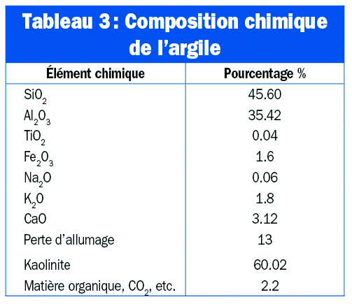 La composition chimique des argiles a été effectuée par la technologie Fluorescence X, on constate que l’argile utilisée est hautement kaolinite avec une perte à l’allumage de 13,06 %. La valeur de la perte d’inflammation est liée à la déhydroxylation des minéraux argileux, à l’oxydation de la matière organique et à la décomposition des carbonates, hydroxydes.