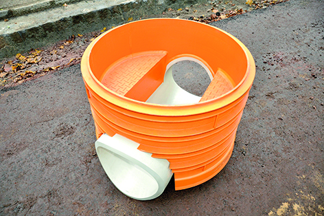 Le fond du regard en polypropylène DN 800 est chaudronné en usine puis livré sur chantier avec une cunette permettant de s’ajuster par la suite aux collecteurs existants.
