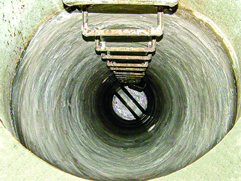 Les échelons du regard à rénover sont meulés afin de libérer de la place pour l’installation du nouveau regard en polypropylène.
