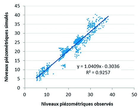 Le modèle a été calé à partir des niveaux piézométriques mesurés en 6 piézomètres représentatifs répartis sur la zone modélisée (figure 9), à des périodes différentes entre 1992 et 2016. Le calage du modèle de nappe est satisfaisant car les niveaux piézométriques simulés reproduisent bien les niveaux piézométriques observés (figure 10).